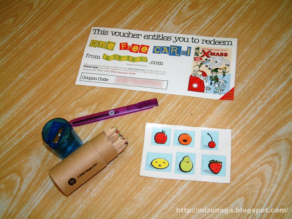 A Foldees.com voucher, stickers by TEH Wedgie, a hp pen, hp sharpener, and color pencils, from hp!