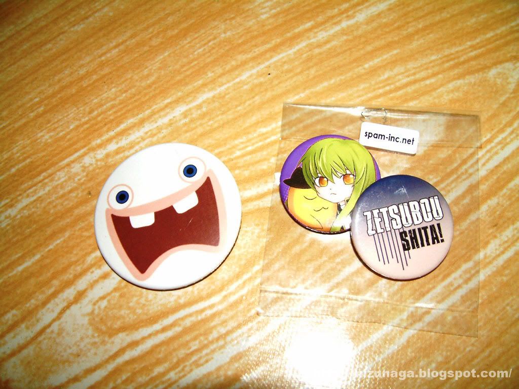 Rabbid badge (RM5), C.C. badge, and a ZETSUBOU badge (RM3.50 ea). There was also a pedobear badge, but it was sold out by the time I decided to get it. :( Admittedly, I hesitated over buying the C.C. badge, because the artwork isn't too fantastic.